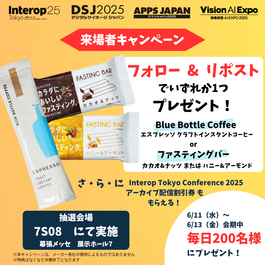 先着200名様に「Blue Bottle Coffee エスプレッソ クラフトインスタントコーヒー」or「ファスティングバー」と「Interopカンファレンス2025 アーカイブ配信10%OFF券」プレゼント ※特典は無くなり次第終了となります |